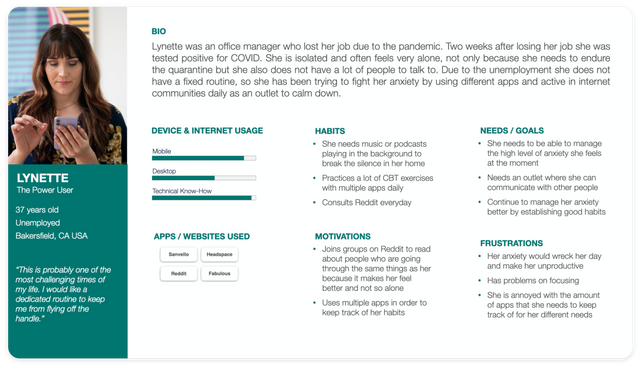 Based on the information I gathered on my research, two very different personas were born: Lynette and Tobias. These two represented OLIVE’s potential users and were the constant inspiration of my design choices and served as a reminder that all users were different.